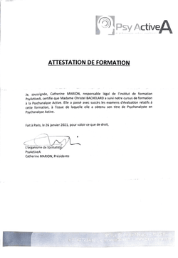 Diplômée d’une licence de psychologie à Paris 5, d'un Master de Communication du Celsa, et formée àla psychanalyse active avec l’organisme PysactiveA de Catherine Marion, je suis certifiée en tant que psychanalyste.